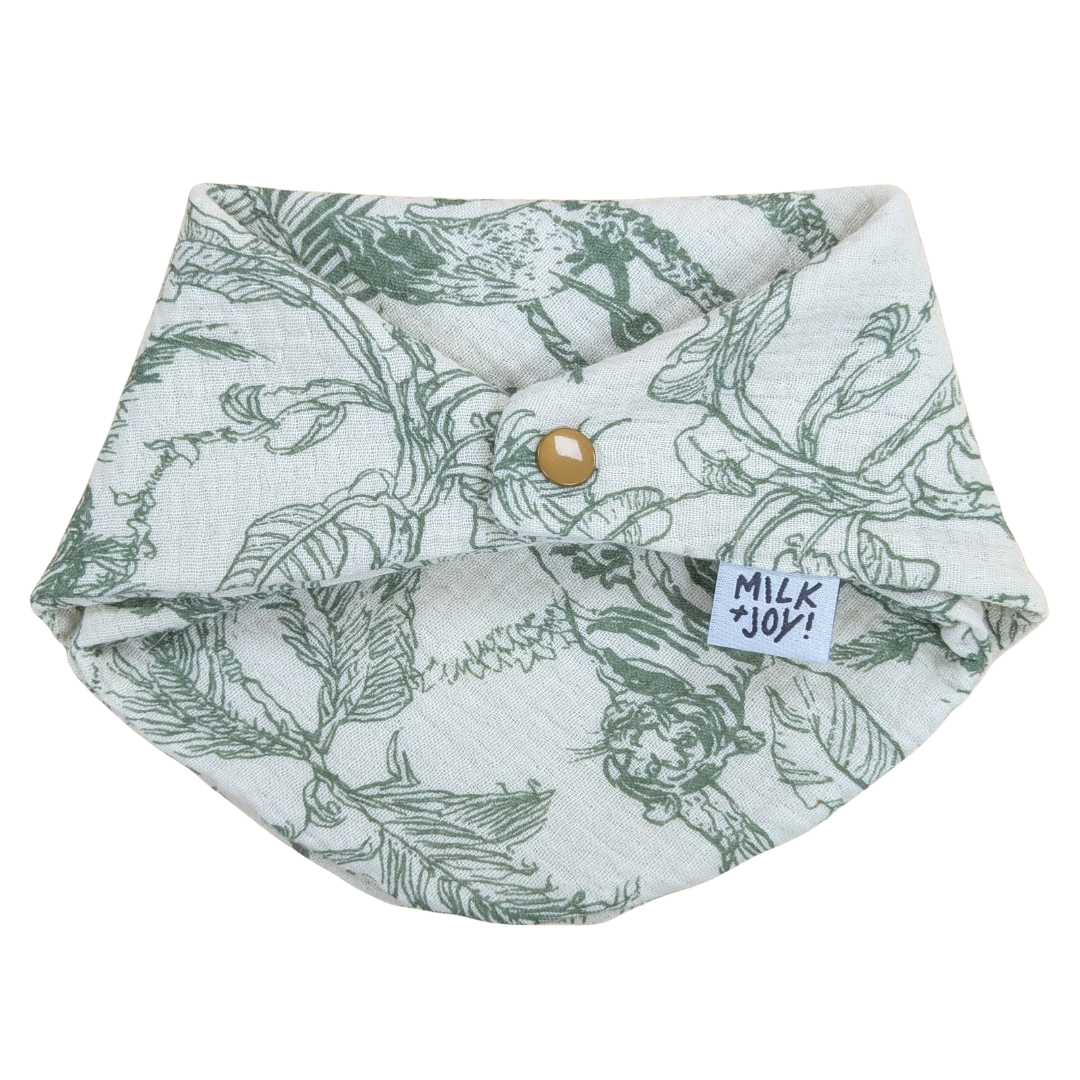 Our unique double bibs are made from 100% cotton Oeko Tex certified double gauze (a fabric you might know as muslin) with eight layers of super soft fabric protecting your baby's skin. They flip inside out to contain all the wet and mess inside the super absorbent fabric.