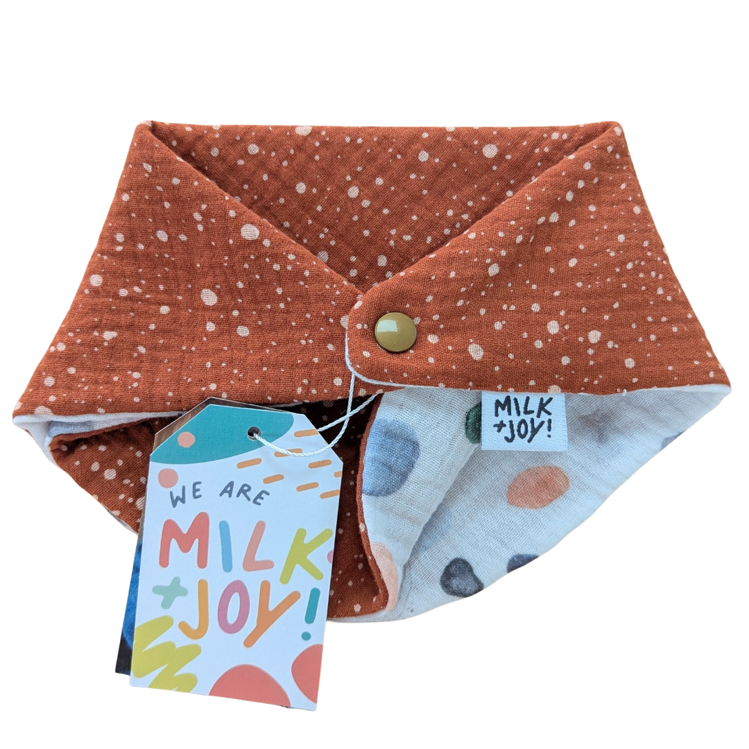 Ready to post reversible double bib - Rust Speckle / Watercolour Drops Our handmade reversible...