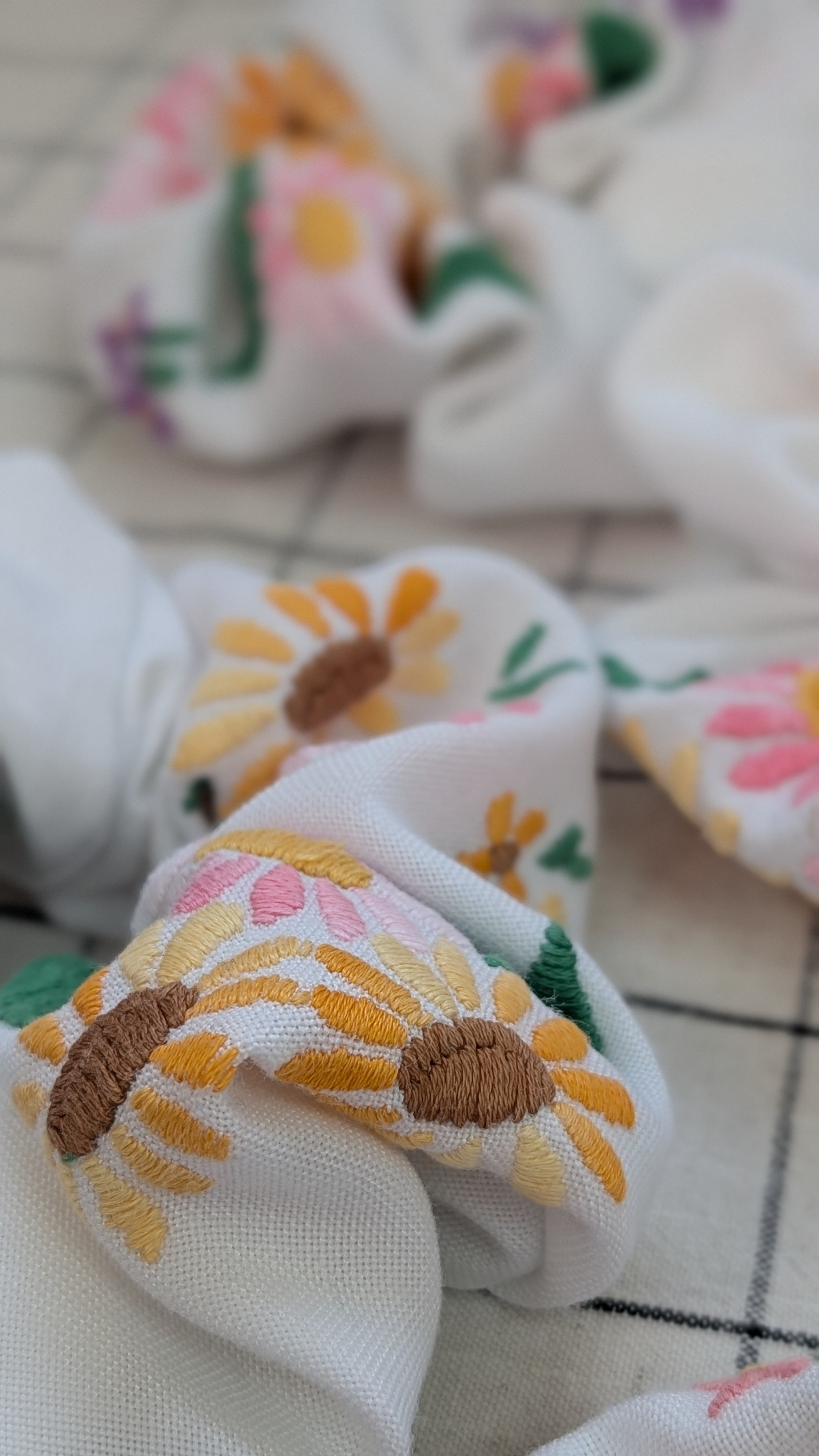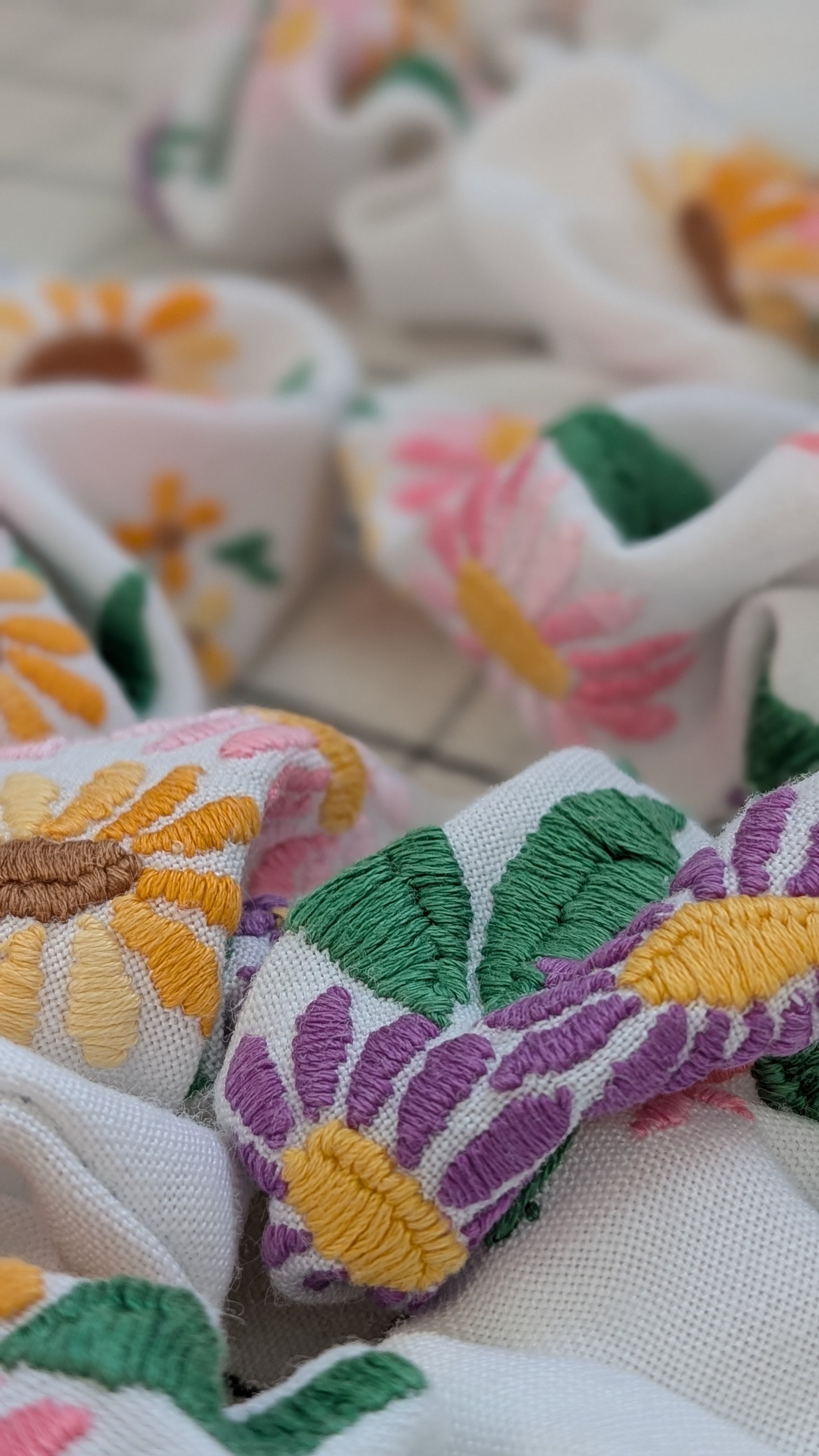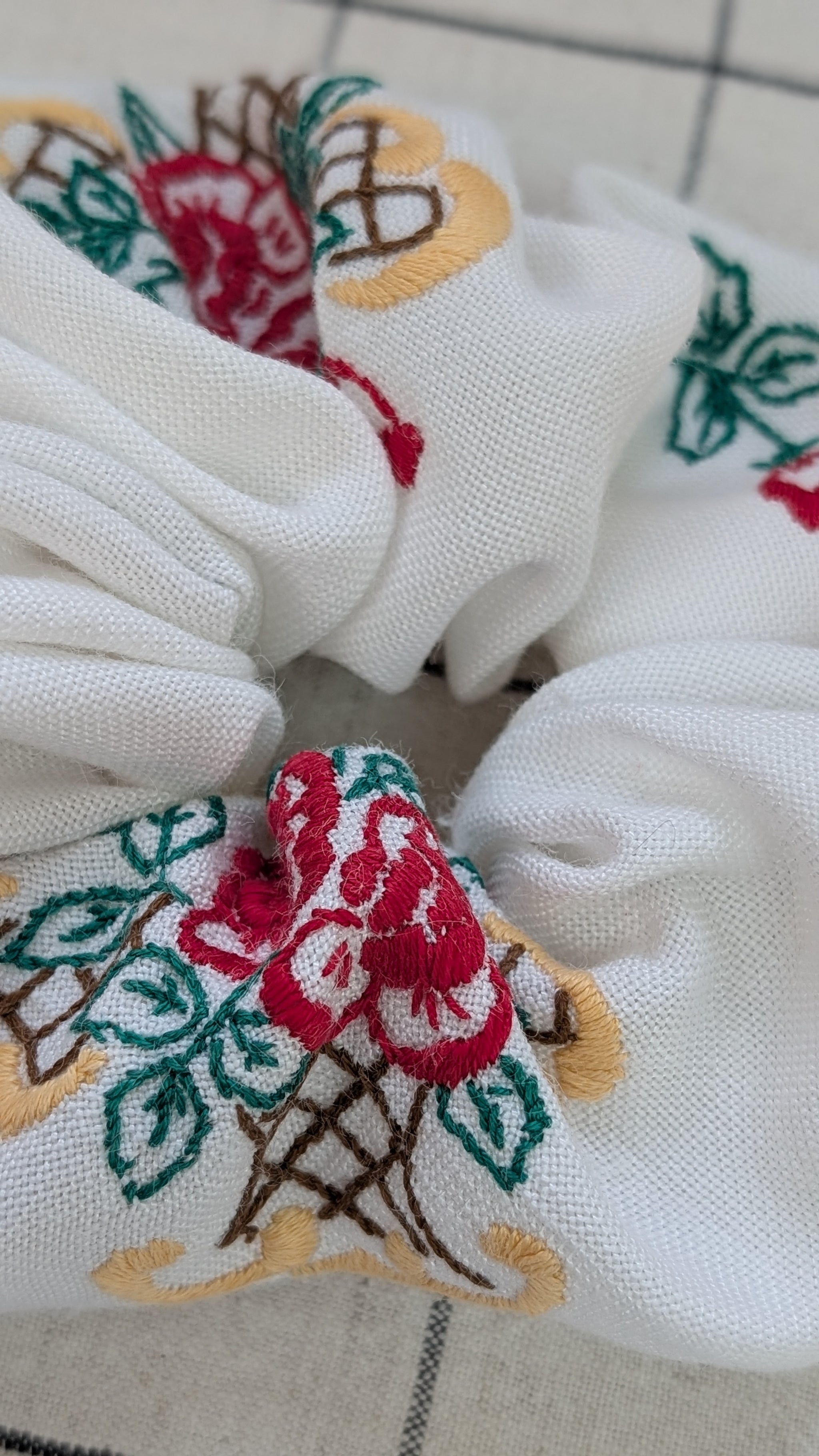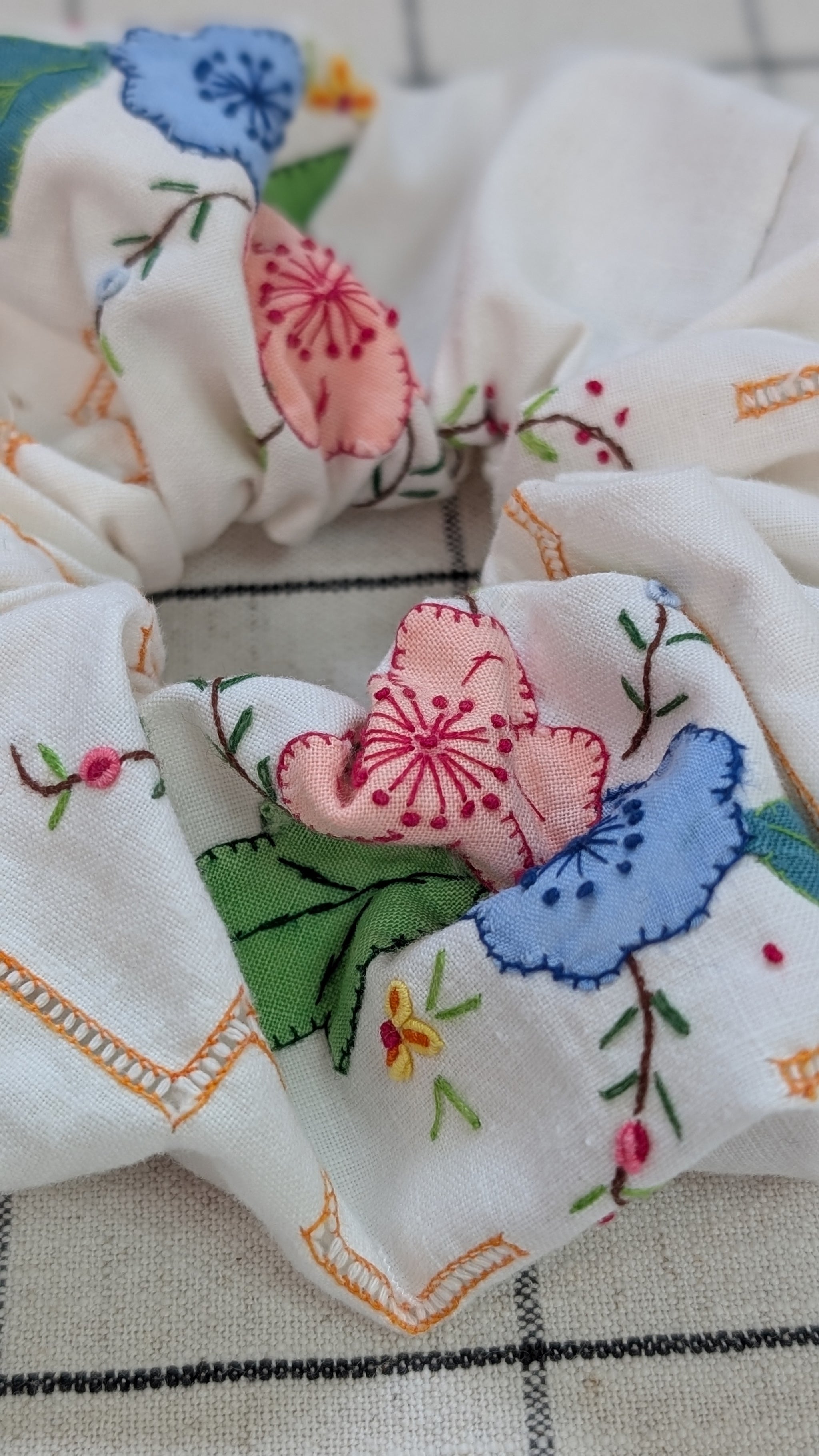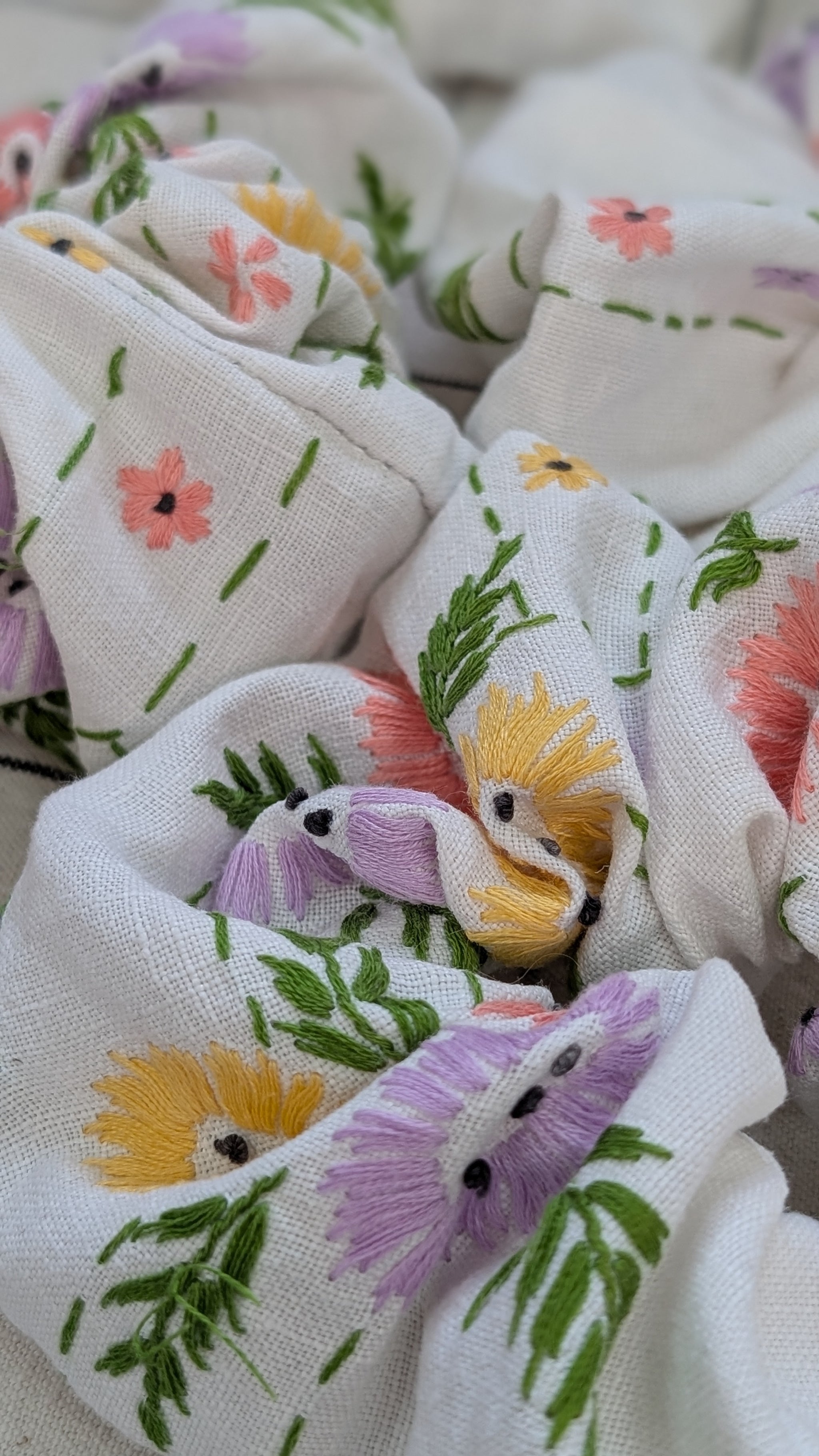 I have been collecting these beautifully embroidered vintage linen and cotton tablecloths for years. I am really passionate about reducing textile waste and although some of these had imperfections, tears, stains or burns I knew they could be up-cycled to be enjoyed again. Breathing new life into these charming works of art creating a gorgeous collection of one of a kind pieces honouring their original craftsmanship